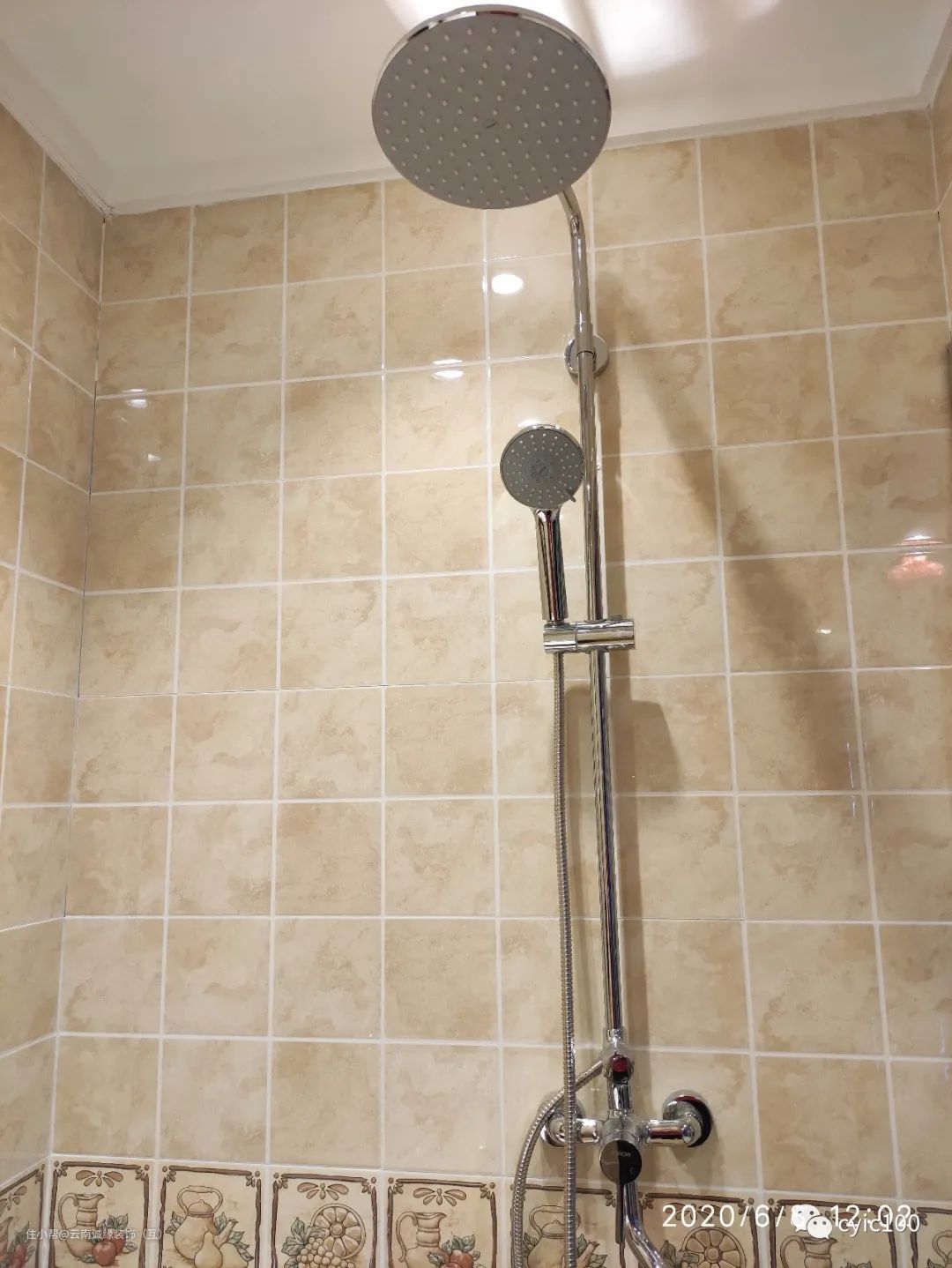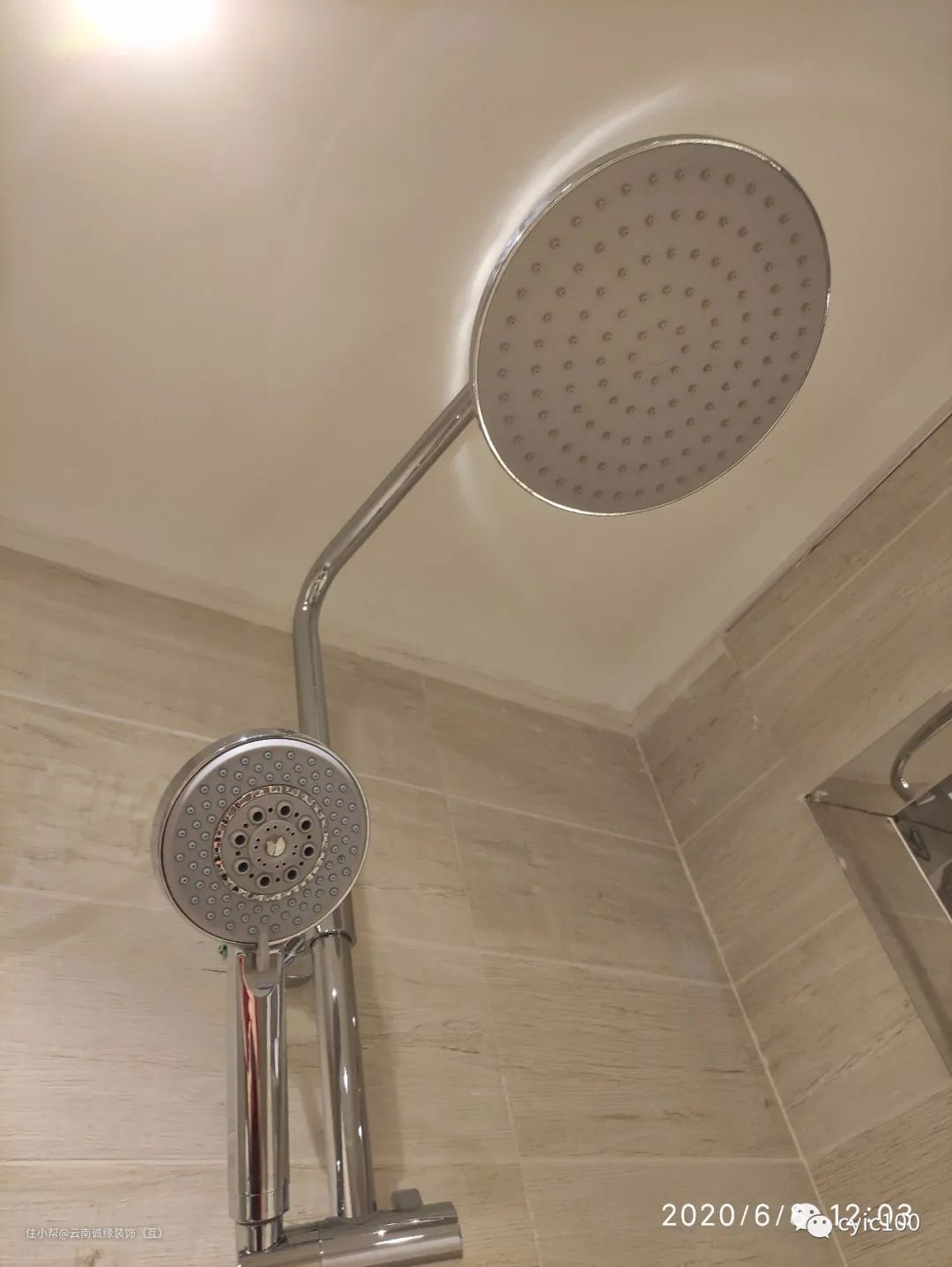 2、头顶:一般称花洒指的就是这个固定结构,头固定在头顶位置,支架入墙,不具备升降功能,不过花洒头上有一个活动小球,用来调节出水的角度,上下活动角度比较灵活;