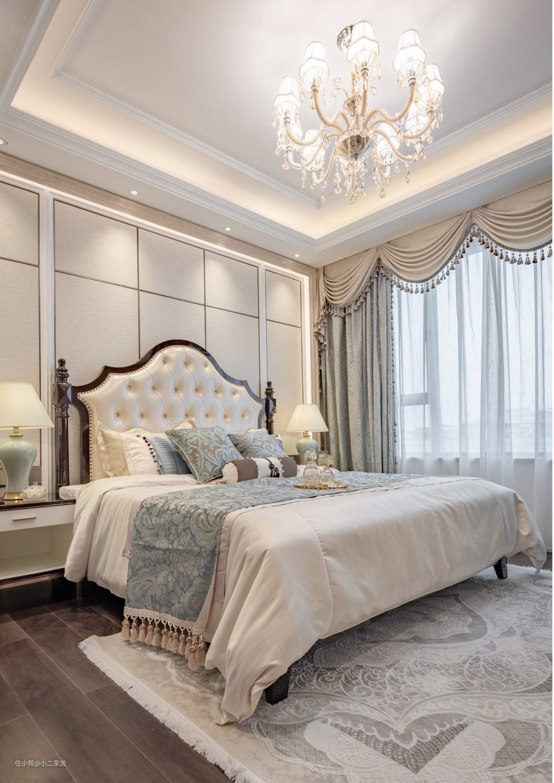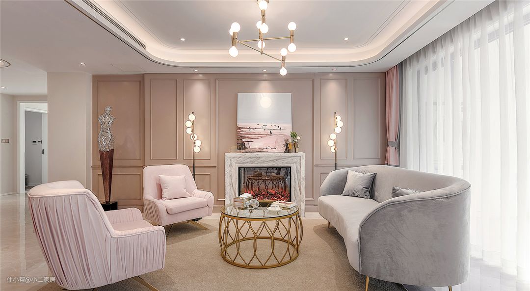 传统的美式风格客厅设计,吊顶并没有大费周折,甚至做得有些隐蔽,不像以往一般石膏线要至少贴在墙壁和天花的交界处。但是该细致的地方还是非常细致,比如说吊灯,比如说吊灯对应着的吊顶雕花。
