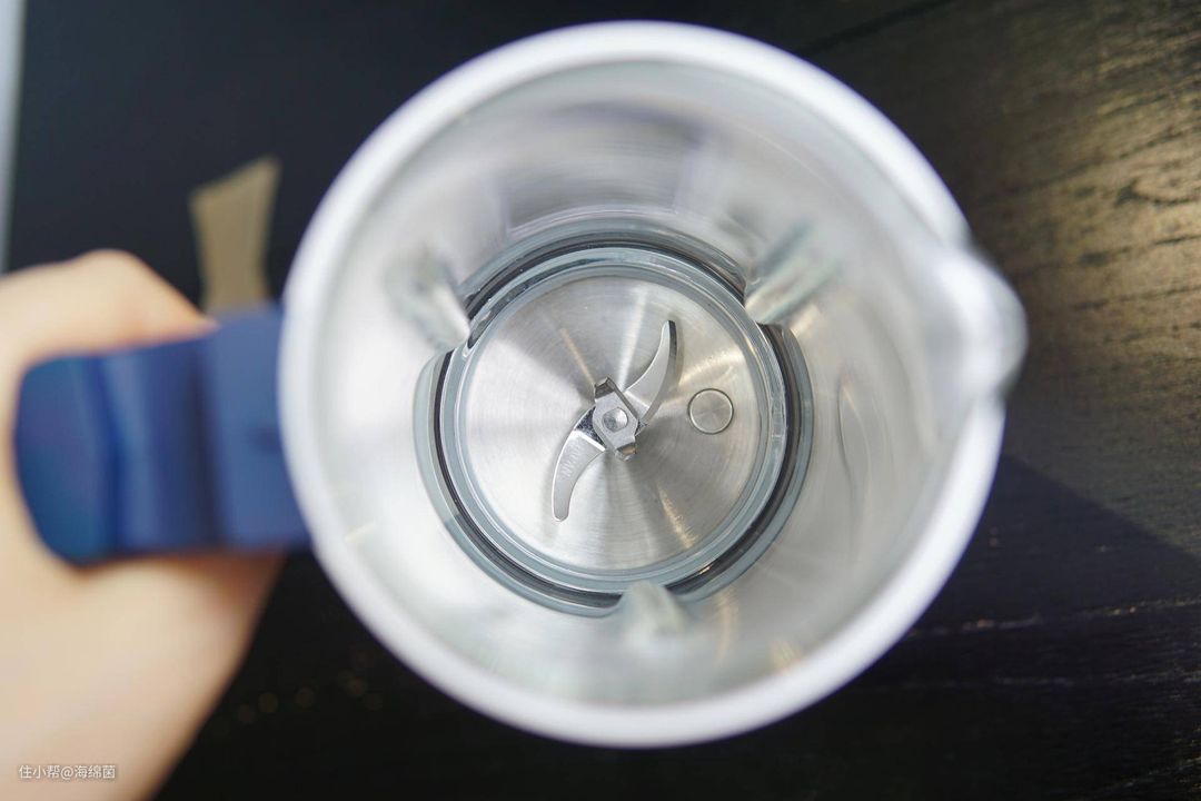 从上往下可以看到内壁上有三条立体扰流条,可以有效减少研磨的死角,尤其是针对本身密度轻且薄的食材,比如蔬菜叶这种,就不会仅仅只沿着内壁旋转,撞到扰流条之后就会被吸入刀头打碎。