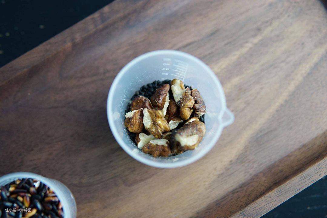 我额外添加了15g黑芝麻和15g核桃仁,感觉黑米和黑芝麻般配。