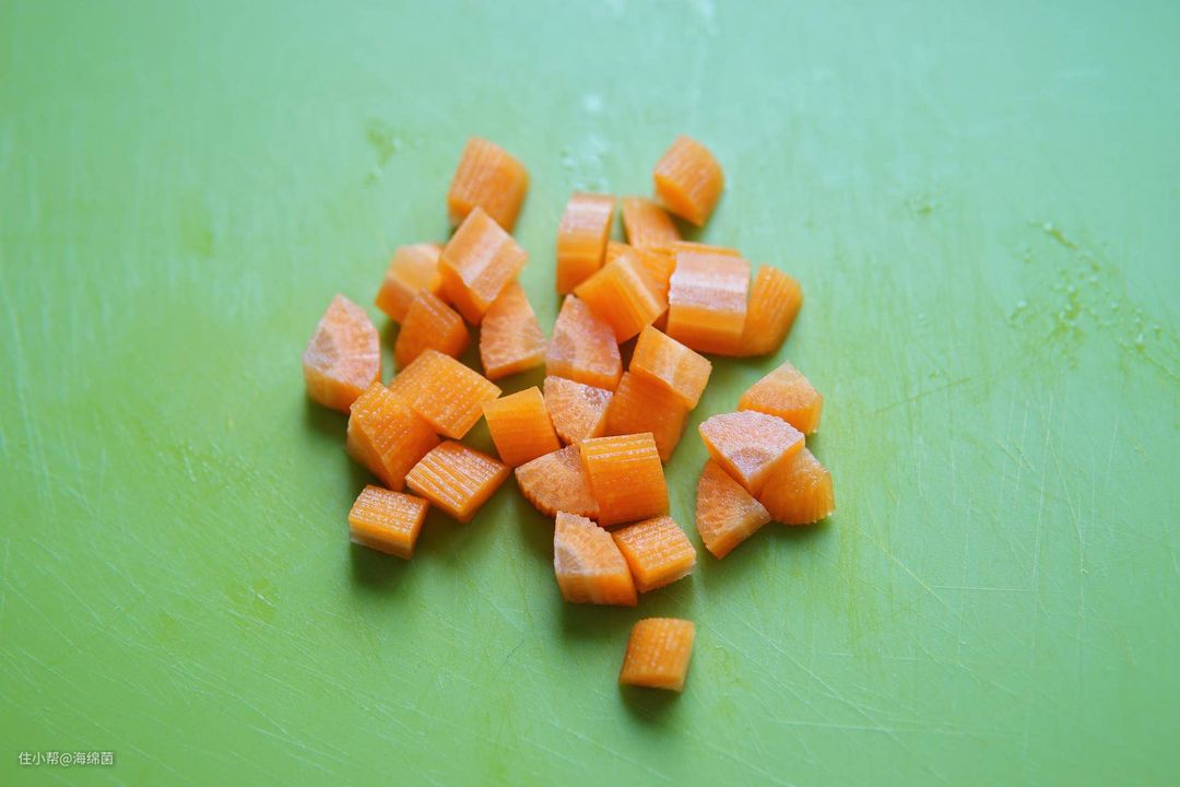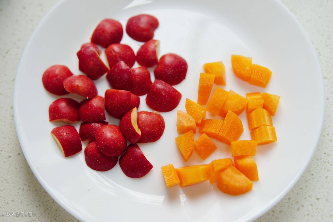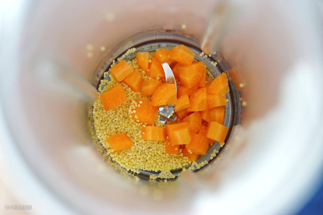 小米满杯,20g胡萝卜切小块,1.5cm左右的块状就行。