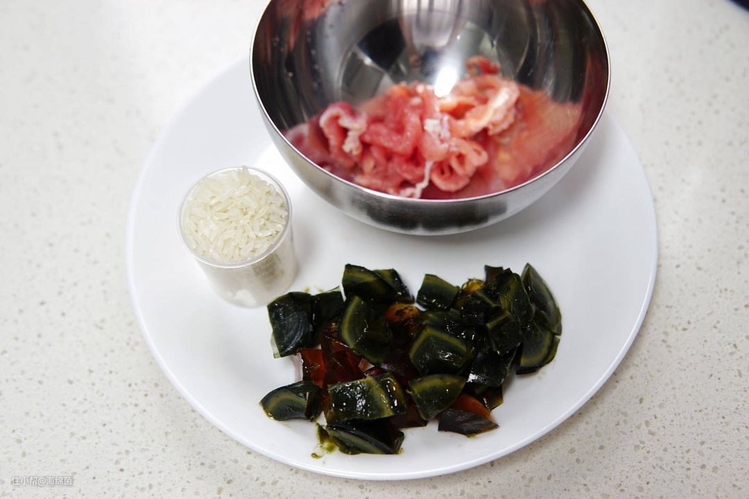 满杯大米,20g肉丝,1个皮蛋切块。