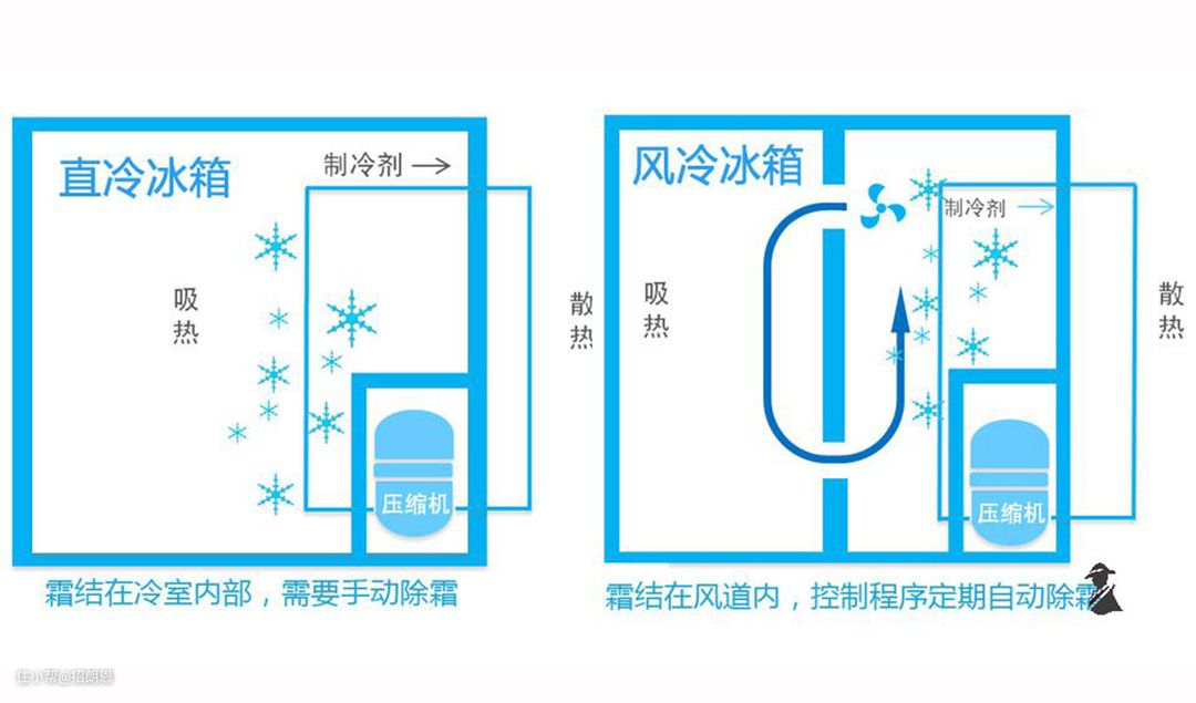 我们在选购冰箱时,更愿意购买风冷冰箱。因为风冷冰箱不会结霜,它主要是靠小风扇把冷气吹到冰箱内,有自动化霜的能力,而直冷冰箱靠蒸发器接触冰箱内壁实现降温,所以更容易结霜。
