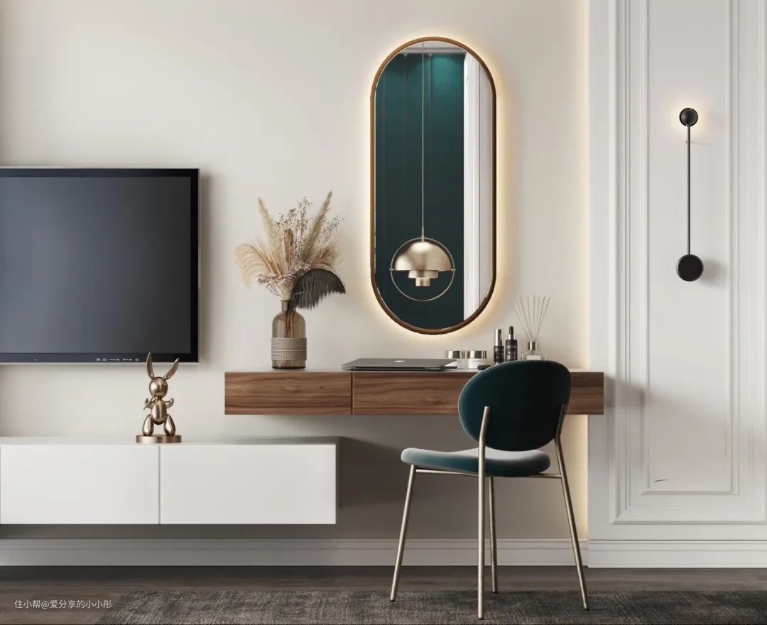 如果你有一个衣帽间,可以选择在衣帽间内开辟出梳妆搭配的区域,只需在装修之初预留出一块安装穿衣镜的地方即可。