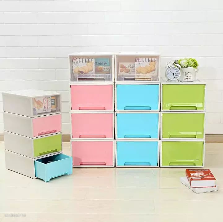 需要一个他很容易拿和收的柜子,最好是抽屉的,而且单个抽屉不能太大,要让孩子一眼看的到玩具。某宝搜索关键词 “塑料抽屉收纳柜” 便宜又好用。