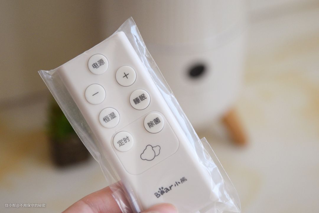 另外小熊落地式加湿器还附送了一个遥控器,不需要弯腰,不需要移步,无论你在哪里,都可以通过遥控器来控制,机器上的功能,遥控器上也都有,懒人福音。