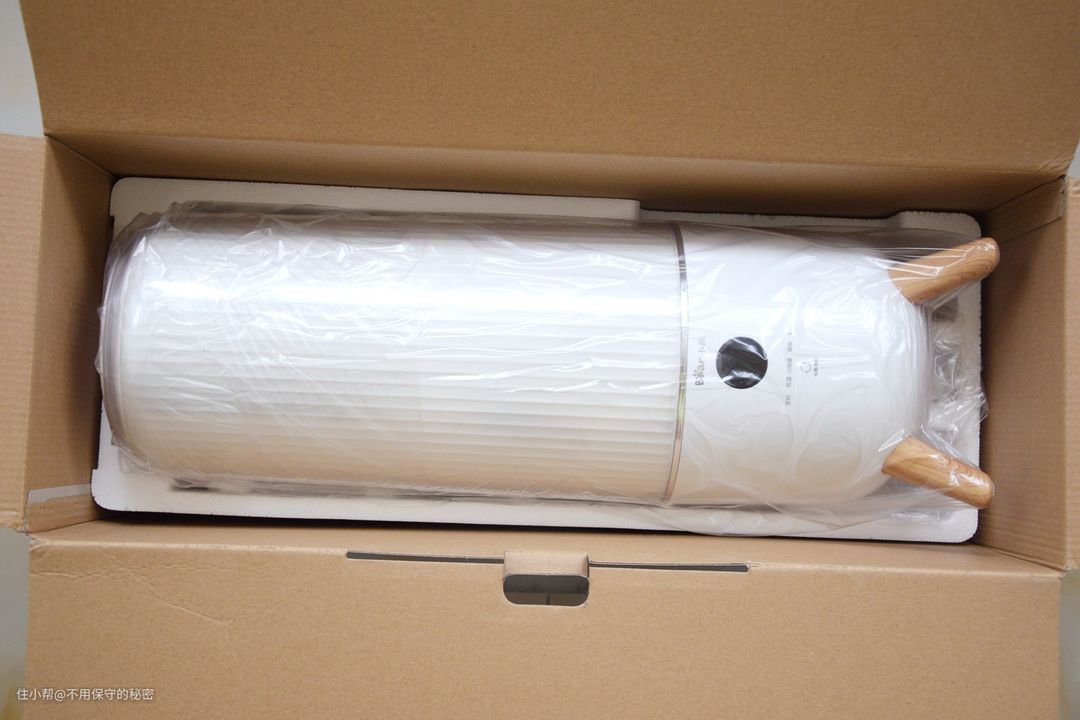 加湿器被固定在泡沫模具中,非常牢固,整体白色设计,简洁大方,不管你是什么家居风格,均能完美搭配。尺寸是180*180*532mm。