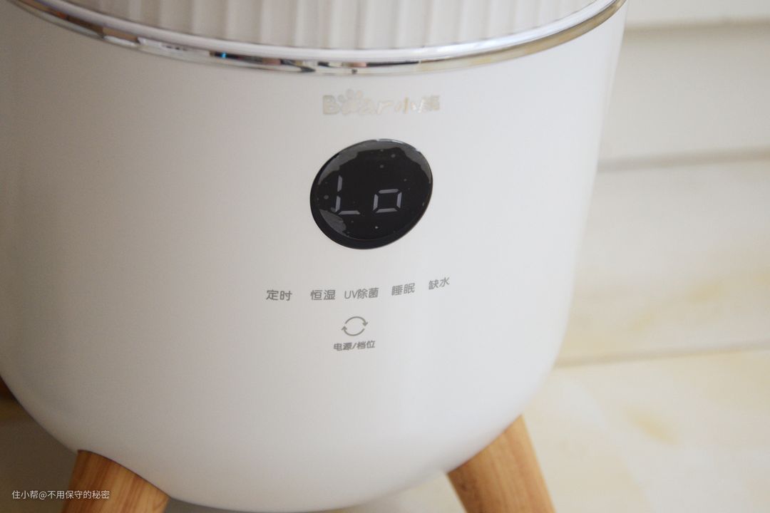 机身为双层结构,下方是主要控制部分,五个指示灯分别是定时、恒湿、UV除菌、睡眠、缺水。