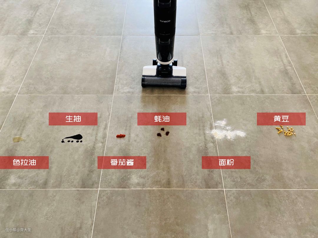 说实话这组实验有点出乎我的预料,因为原定计划是将色拉油、面粉、黄豆作为典型的液体、粉状物及大颗粒进行测试,结果忘记了和吸尘器不同,面粉在遇水之后黏性会瞬间增强且结团,大大增加清洁难度。所以并未一次性处理干净,实际测试是往返2次才完全拖净,结果依旧令人满意。