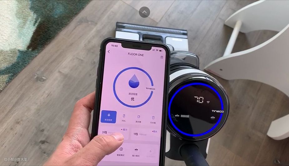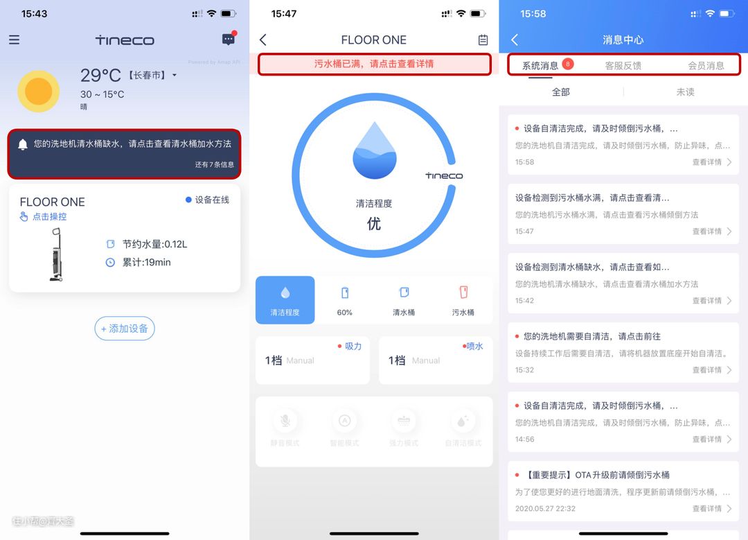 除屏显外,机器还可发出语音提示:如污水桶已满、清水桶缺水、开关机等,配套的app也可以对机器工作模式进行自定义配置并查收相关推送。