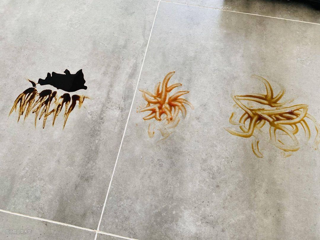 为了增加实验难度,还将生抽、番茄酱、蚝油等高染色性、高粘稠度的调料探匀在瓷砖上并静止一阵,以形成更顽固的污渍。