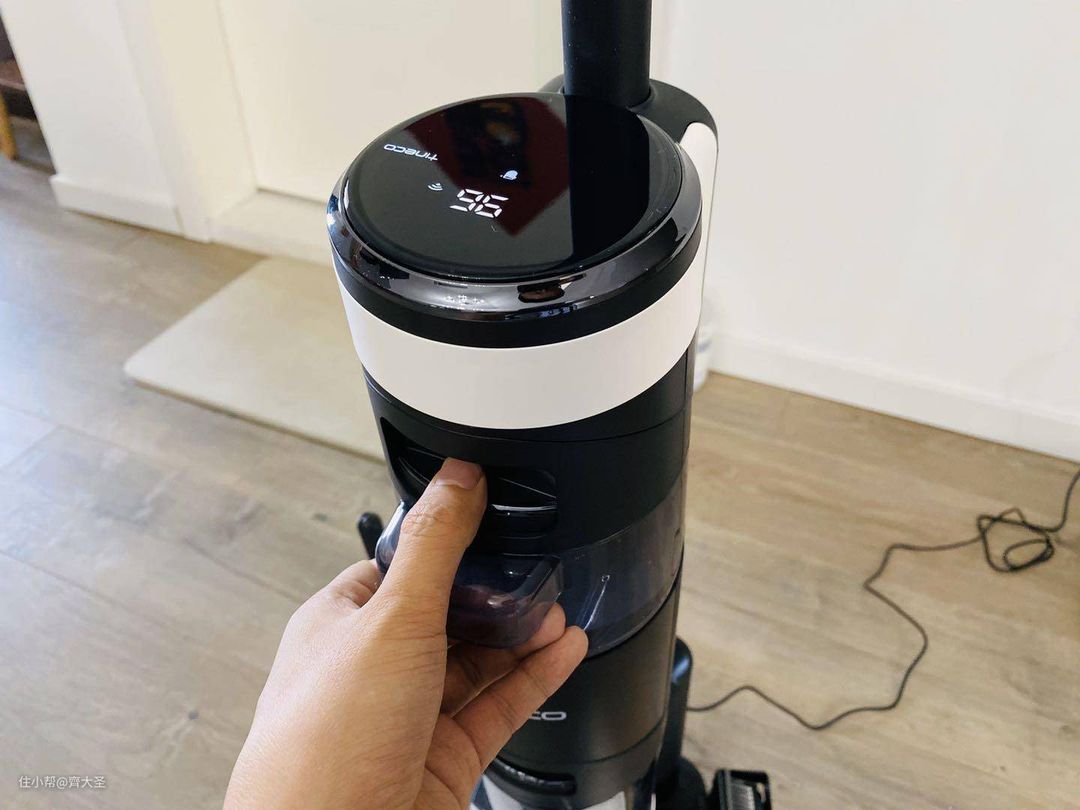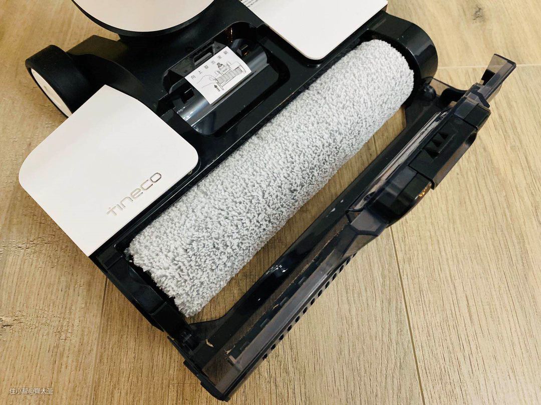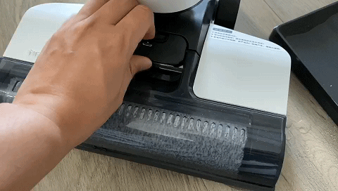 但其实这台洗地机的神奇之处之一就是可以进行「自清洁」,通过外壳前部的软胶条刮掉滚刷上的污渍,然后通过电机产生的吸力将污水及杂物吸入污水桶。