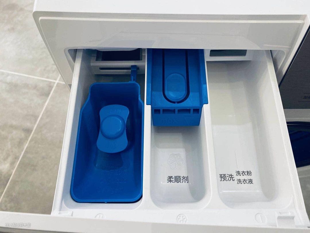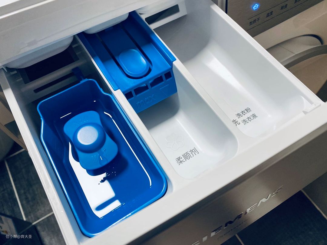 西门子经典的洗涤剂抽屉设计,做的很大,使用和清洁都很方便,并在盒体上用中文进行了标注,哪怕初次使用也不必担心加错位置。但是左侧蓝色洗涤剂盒由于并未固定,在机器高速脱水时会由于碰撞产生一定的噪声。