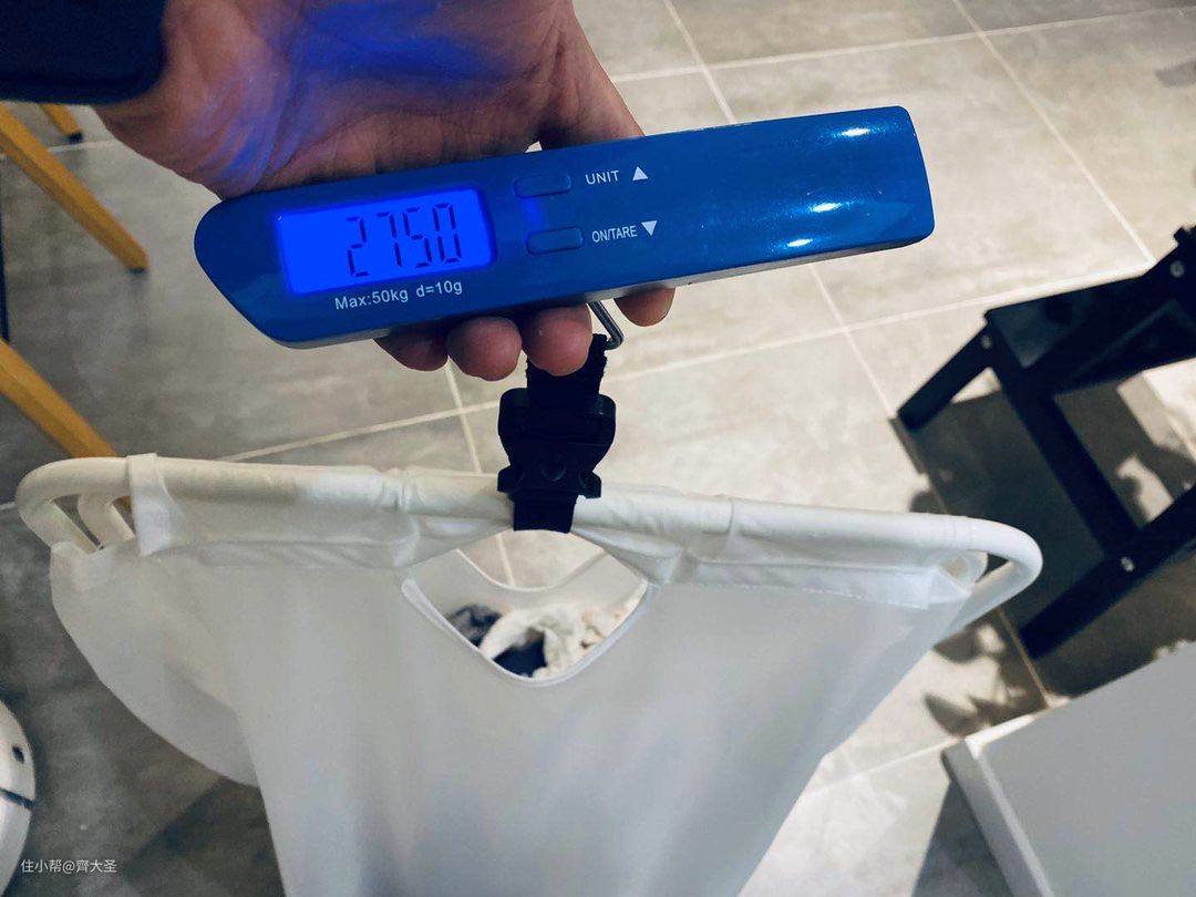 烘干后,衣物(含脏衣篮)总重2010g,相比清洗前的1940g,增加了70g,如不考虑纤维绒毛损失,则增重为未烘干的水分。