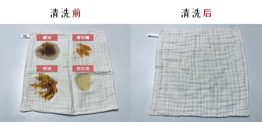 先拿了女儿一张双层的纯棉手帕进行污渍模拟,包括酱油、番茄酱、蚝油和色拉油,为了尽量还原生活场景,所有污渍均晾干后进行洗涤。