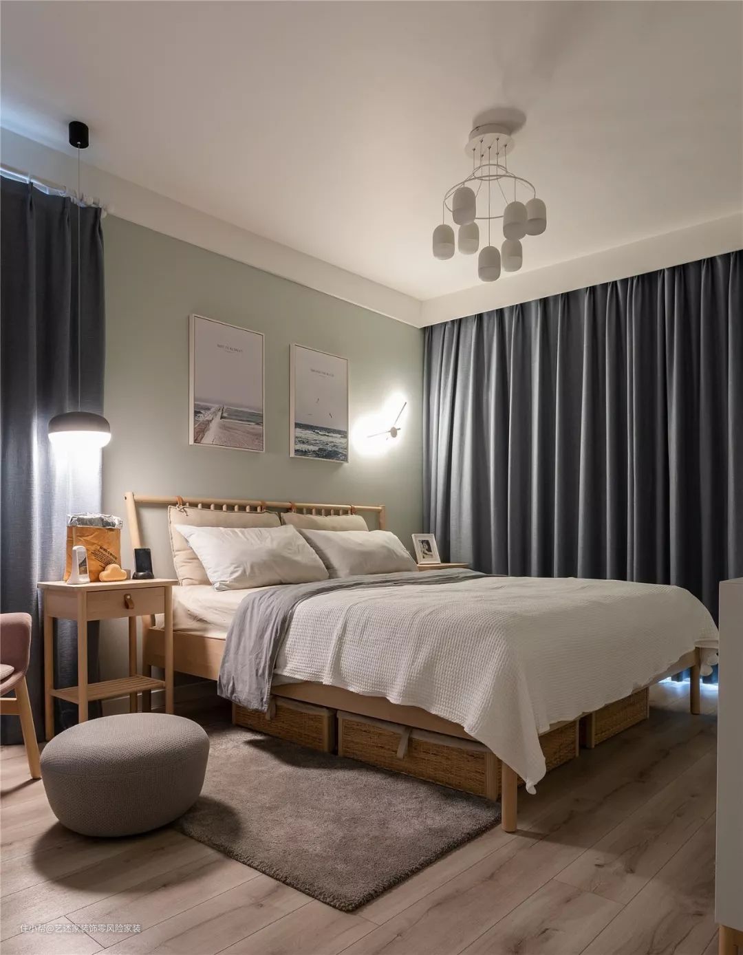 主卧地面铺设木色地板,墙面为了整体搭配选用了与客厅同颜色的乳胶漆,整体清新又有文艺气息。