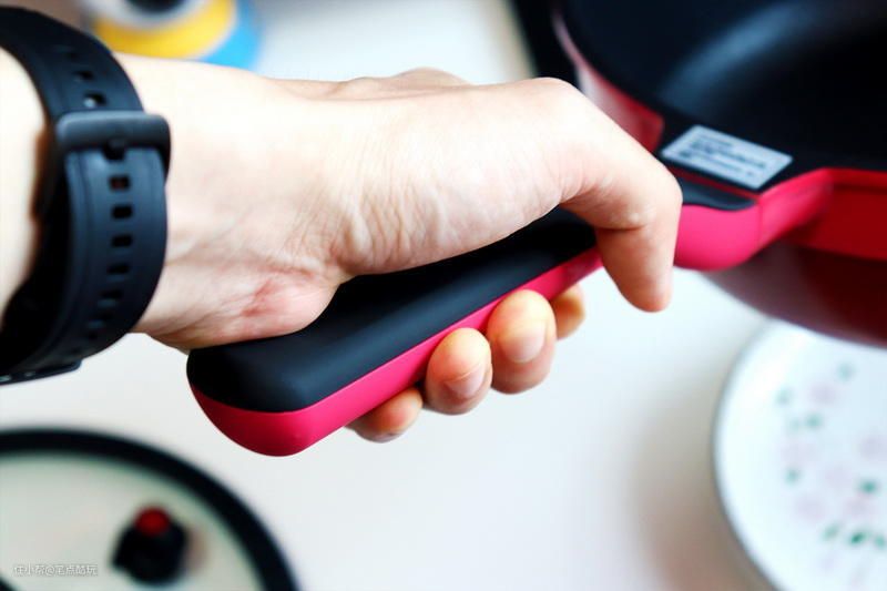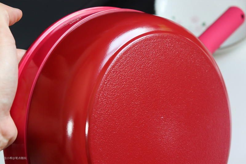 把手与锅体衔接稳固,不必担心断裂,盛满菜肴时单手端起要吃力一些,此时另一侧的锅耳朵就起作用了!不过这一侧并没有防烫材质,因此双手端起还没凉的不粘锅时,至少得有一只手戴好防烫手套。