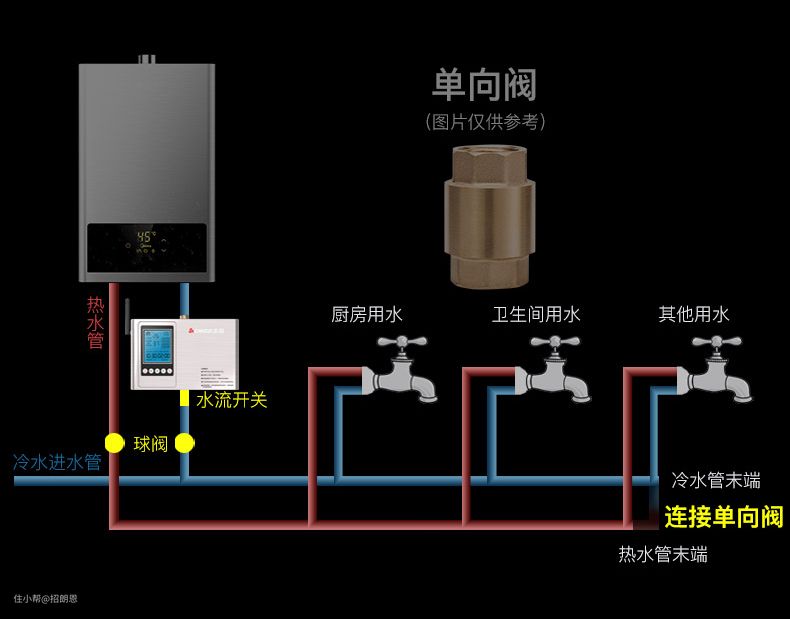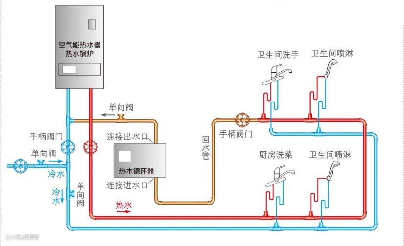 不需要热水回水管的循环泵,只是在热水管和冷水管中间加一个单向阀,让热水管和冷水管连接在一起,让冷水管充当热水回水管的角色。本质上,这跟自带热水循环泵的燃气热水器原理一样,只不过一个是靠热水器里面的循环泵,一个是靠外置的热水循环泵。