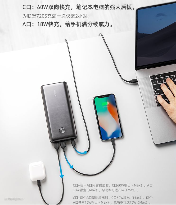 参数方面,这款Anker航母级移动电源,总容量25600毫安,可为Switch充电3.8次,为iPhone 11充电5.9次,为MacBook Pro 2018充电1.3次(假装我有),全面满足各类需求。
