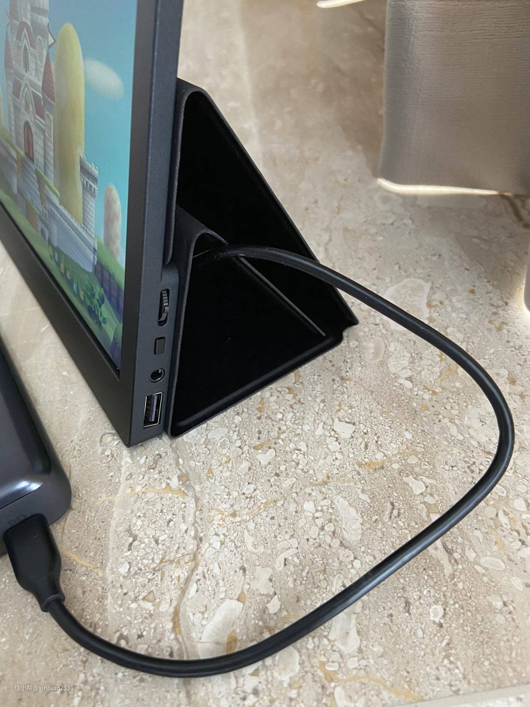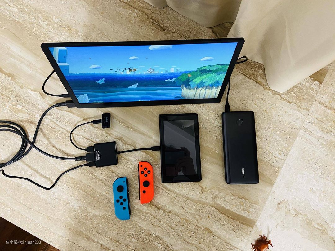 因为支持一线通+双C口盲插,所以连接非常简单。先将移动电源和便携屏链接,再链接Switch,这样可以保证图片传输正常。如果附近有合适的插座的,直接用便携屏的电源适配器也可以,因人而异。