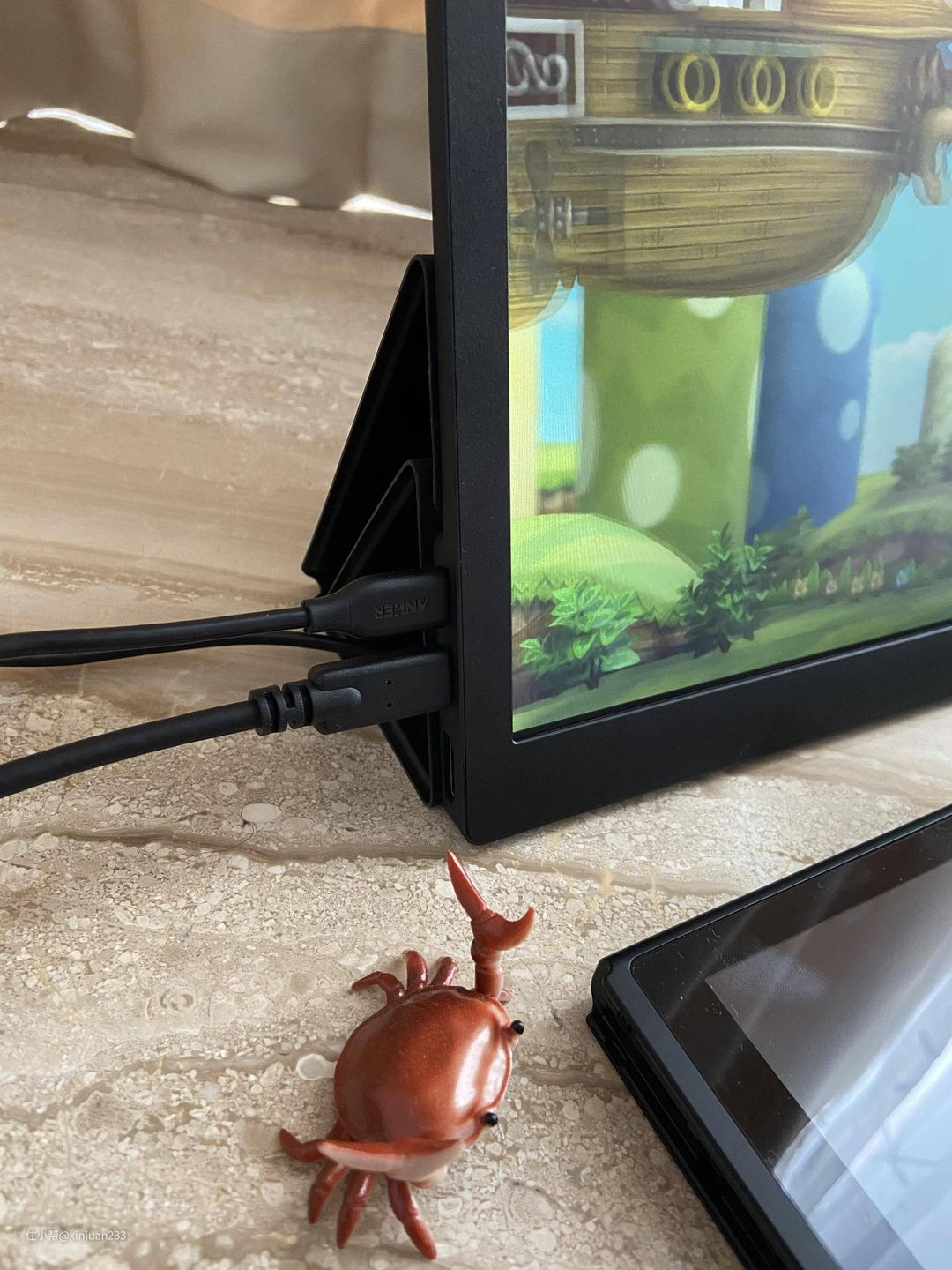 我们看一下,桌面模式需要购置些什么。首先,需要一块合适的屏幕,最好是便携屏幕。因为桌面模式还是比较在乎便携性的,虽然传统的屏幕也可以作为Switch的输出,但是过于笨重了。比如一块27寸的IPS屏幕,你是没法随身携带的。那么,与其选择27寸的显示器,不如一步到位直接变成TV模式,沉浸感更好。所以,掌机模式是便携与画面体验的统一,既可以塞进包里随身携带,又能快速搭建,随时分享,画面素质也要足够OK,这样体验才会好。想象一下,和好友去咖啡馆打发一个下午,从背包里掏出一块便携屏和一台Switch是多么的锦上添花。
