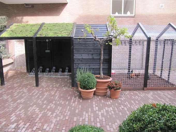 农村的庭院除了会砌花坛种花之外,还会有养鸡的可能。利用钢丝网搭建、折叠出小木屋的形式,外观好看,也能清楚的看到里面的情况,隔壁还给它们做了一个晚上休息的鸡窝;鸡窝之外还是大家活动的场所,干干净净的。