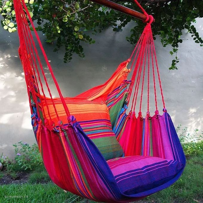 而农村的院落,吊床就更加的自由了。借用粗壮的大大树,分分钟搞定吊床固定的问题,放进配套的七彩坐垫、靠枕,捧着书本或手机,也很舒服,重要的是周边的环境开阔宁静。
