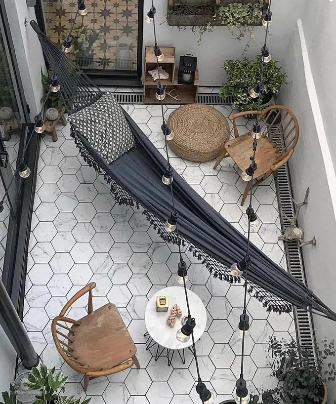 原本的红墙、水泥地,是庭院的基础标配;利用闲暇之余,可在墙边堆砌花坛,倒入适量的土壤之后,在春天撒进花种子等待着发芽、成长、开花;院落的中间,可以摆放一套黑色镂空的桌椅,再来一杯茶、一碟瓜子,半下午的时光可以开始了。