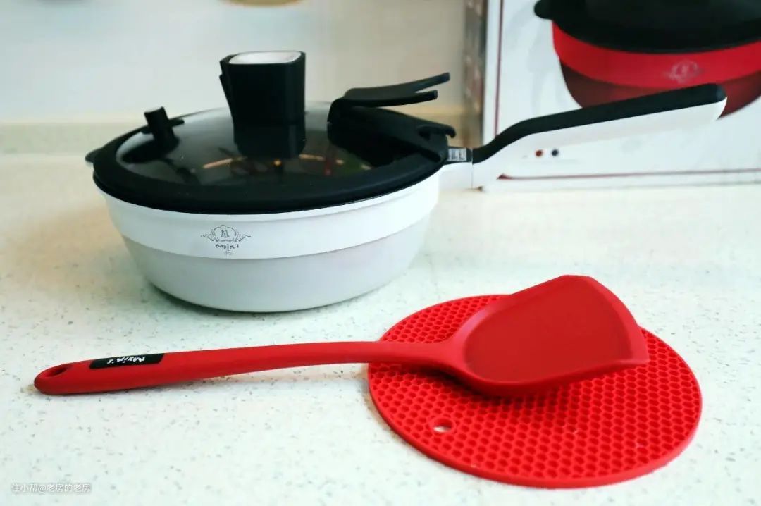 赠送的这把铲子尤其值得好评,和常见的防烫橡胶铲软趴趴的感觉不同,马克西姆这把铲子只是铲头部位是软的,以此保护不粘锅涂层不被破坏。铲子的本体在橡胶的包裹下则很坚硬,方便翻炒菜品。