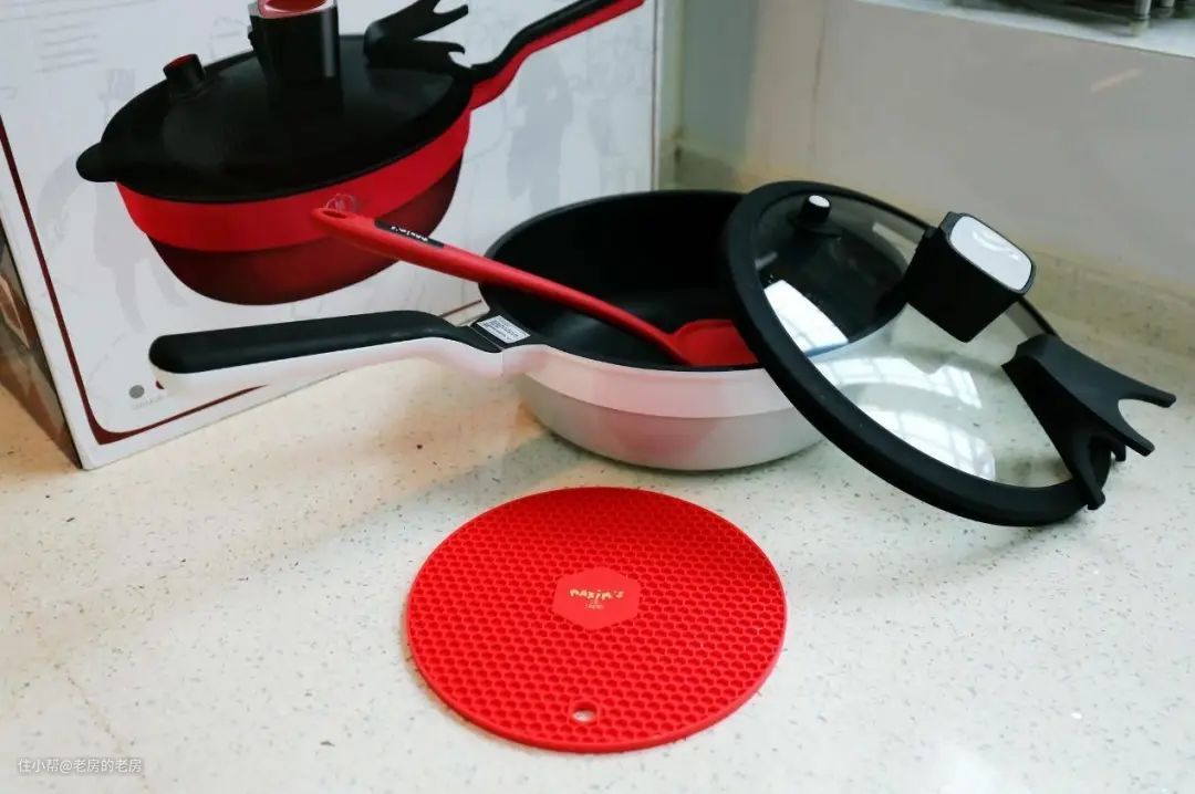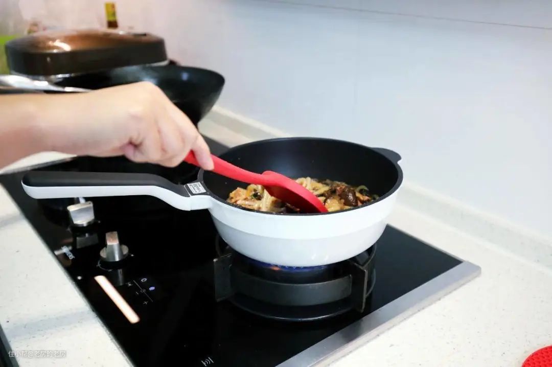 相较于传统大铁锅的“黝黑笨重,五大三粗”,马克西姆这款微压不粘锅在外观造型上就已足够夺人眼球,老房的这款为海盐灰配色,和灶台面板颜色很搭。正锅重量也就两斤不到,老婆做饭也能轻松颠起来(千万别用钢丝球刷不粘锅!)。