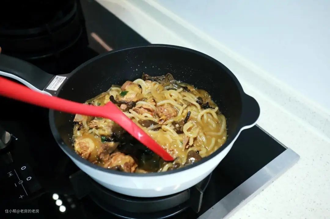 其次是不粘,小鸡炖蘑菇放粉条才最好吃。但粉条富含淀粉,稍不留神很容易糊在锅底。但这道菜咱们又得炖,最为考验马克西姆的不粘能力。