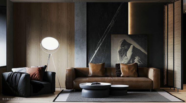 客厅的背景墙是整体空间最有设计感的核心。墙壁左侧采用木纹的集成墙板装饰,而右侧则采用了内嵌式的黑色理石纹设计。一旁富有创意的万向照明灯,灯光漫洒在高档小牛皮沙发上,细腻的光泽与肌肤般的质感,进一步提升了客厅的档次,使整体的高端感跃然而生。