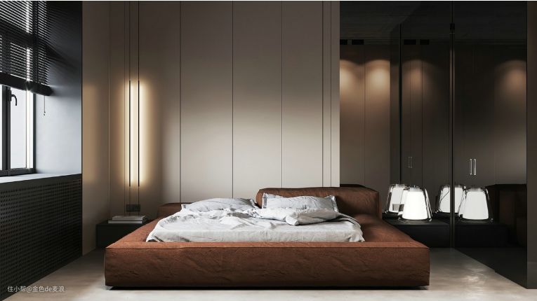 主卧设计得十分大气简洁,百叶窗增加质感的同时也增加了隐秘性,以白色集成墙板作为床体背景墙,再用整段的暖光照明灯,增加房间的采光与高级感,住在这样酷炫又有格调的卧室,是不是一睁眼就斗志满满了呢~