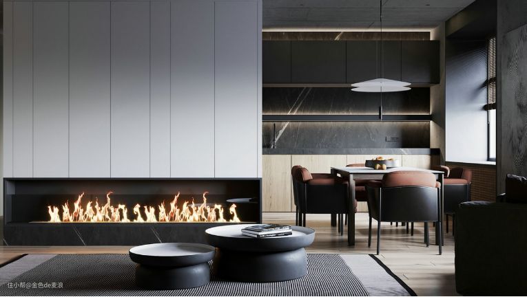 餐厅是开放式的,以半墙做隔断,分开客厅与餐厅的位置。墙体整体用白色的集成墙板做背景,底端处采用了镂空的设计,添加了壁炉的装饰,升腾的火苗装饰,逼真而富有感染力,仿佛不经意间,就让人血流加速,瞬即点燃了心中的熊熊烈焰,斗志满满。