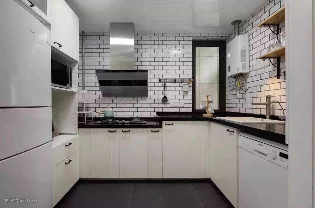 L形厨房的高低操作台,可以在拐角位置做高低台过渡,把炒菜与洗菜区分离出来,自然优雅而又美观。