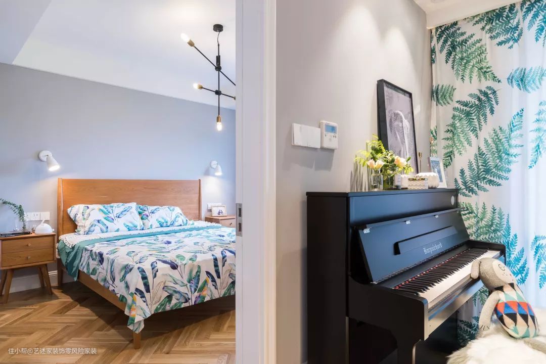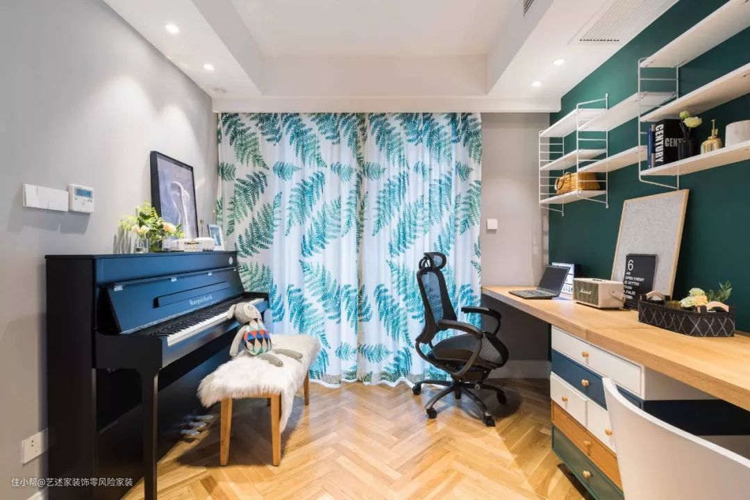 看到书房里的钢琴,就知道业主一定是一个爱音乐的人了,书桌的墙面是很有个性的深青色,和钢琴背景墙的浅灰色形成对比,大部分人很少会在书房设计这样的颜色吧。