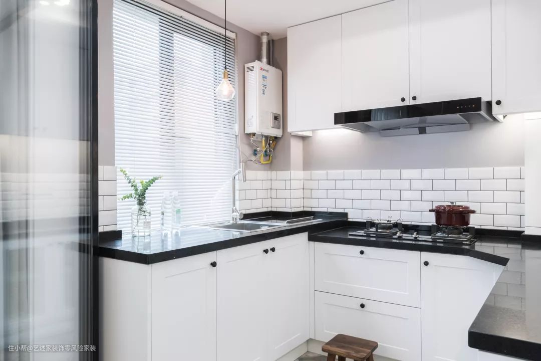 因为户型和空间的原因,厨房设计成了半包围的形式,呈U字型,黑色的大理石台面和白色的橱柜是经典搭配,清洗区、烹饪区分区明显。