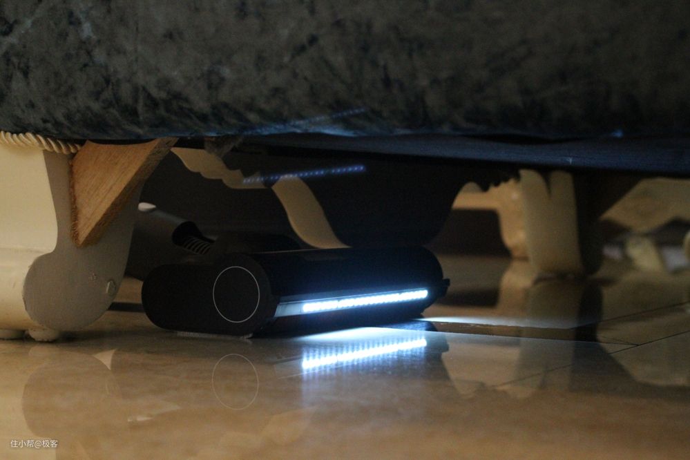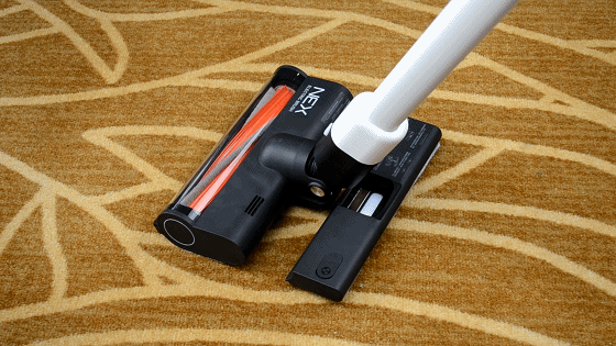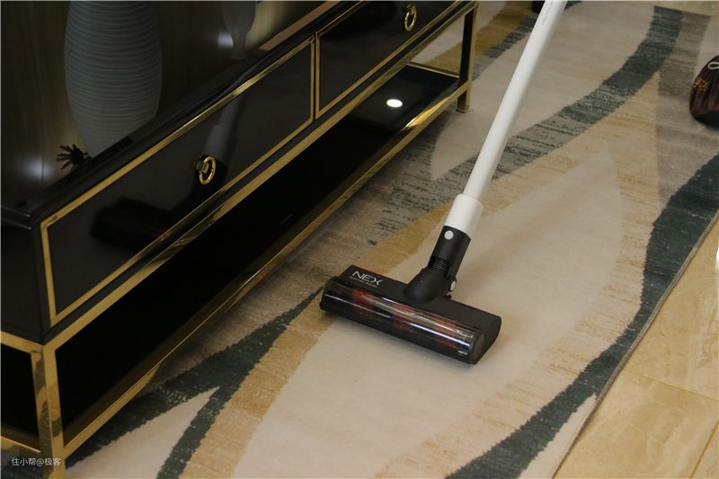 在清洁沙发底部,柜子底部以及床底这些比较难清洁的地方,这款NEX吸尘器也能轻松应对,主要得益于延长杆的作用了。在大滚刷上方前部位置好还设计了光线传感器,当进入比较黑的地方做清洁时,刷头前端的LED灯便会自动亮起,这样地面上的情况就一览无余了,清洁起来效率更高。