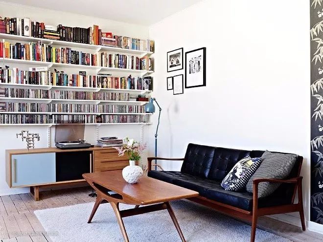 谁说沙发一定要靠墙摆放?谁说背景墙只能是挂画?谁说书房不能放在客厅?把沙发前移10cm,把背景墙换成整面的大书柜,就能把书房挪到客厅,用10cm空间节省下一间房。