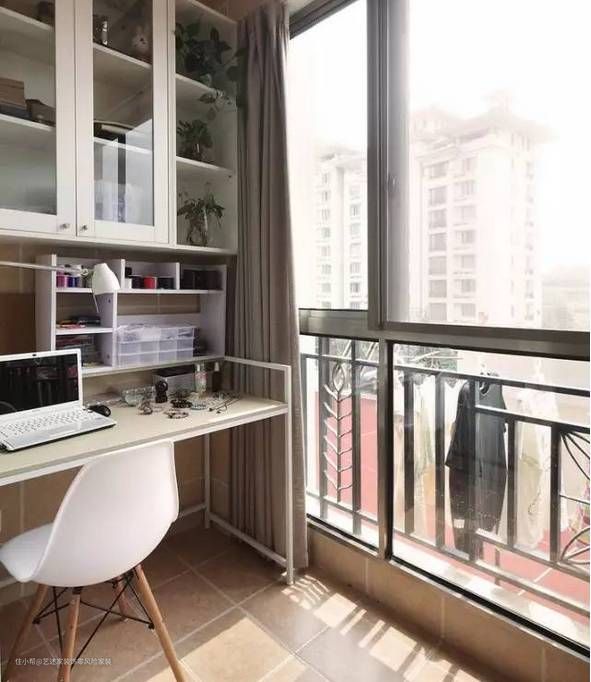阳台改造成书房成为近两年的装修大热。与其把阳台浪费在晒衣服上,不如改造成小型书房,满足自己的书房梦。加上植物的装饰,绝对是颜值超高的书房。