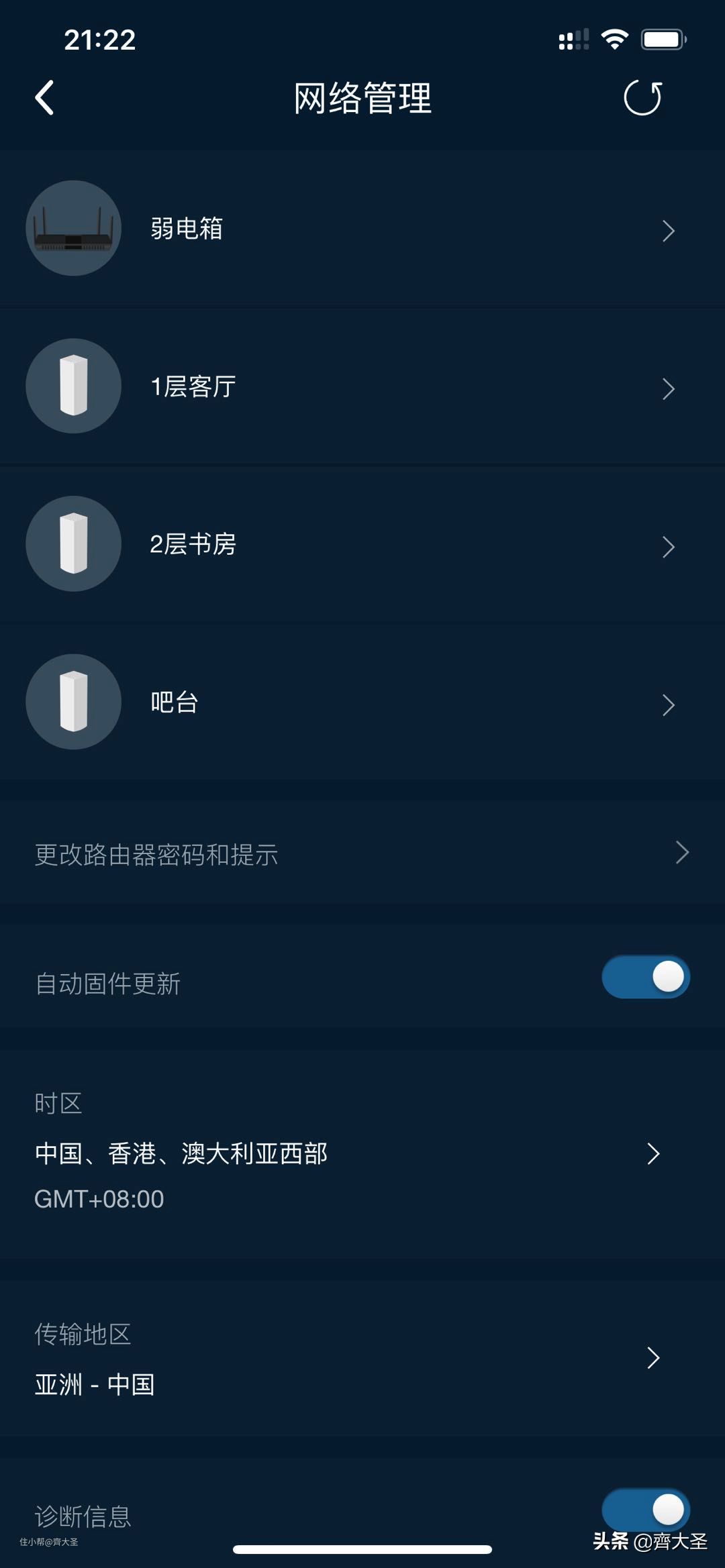 我将其放在弱电箱中连接光猫作为主路由,用网线与2层书房的AC2200做有线回程,另外两个AC2200为无线Mesh连接。