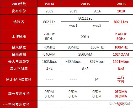 其实就是第6代无线技术——IEEE 802.11 ax,我们不需要知道很多专业的术语,只需要知道相对于wifi5标准,wifi6能够实现更高阶的调制方式(1024-QAM)、更高的带宽(160M带宽)、更完善的MU-MIMO(多用户多进多出),理论带宽达到9607.8M。