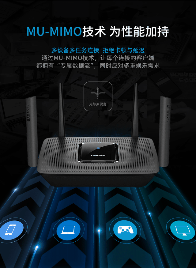 即Multi-User Multiple-Input Multiple-Output 的缩写,直译为“多用户 多输入 多输出”, 是最新Wi-Fi技术标准802.11ac Wave 2(即802.11ac 2.0标准)的最重要特性之一,能彻底改变Wi-Fi网络的运行方式,显著提高网络总吞吐量和总容量,将上网速度提升三倍。802.11ac Wave 2另外两个特性是数据传输通道最高可扩张至160MHz提供第四空间流,可真正实现网络资源的充分利用和性能提升。