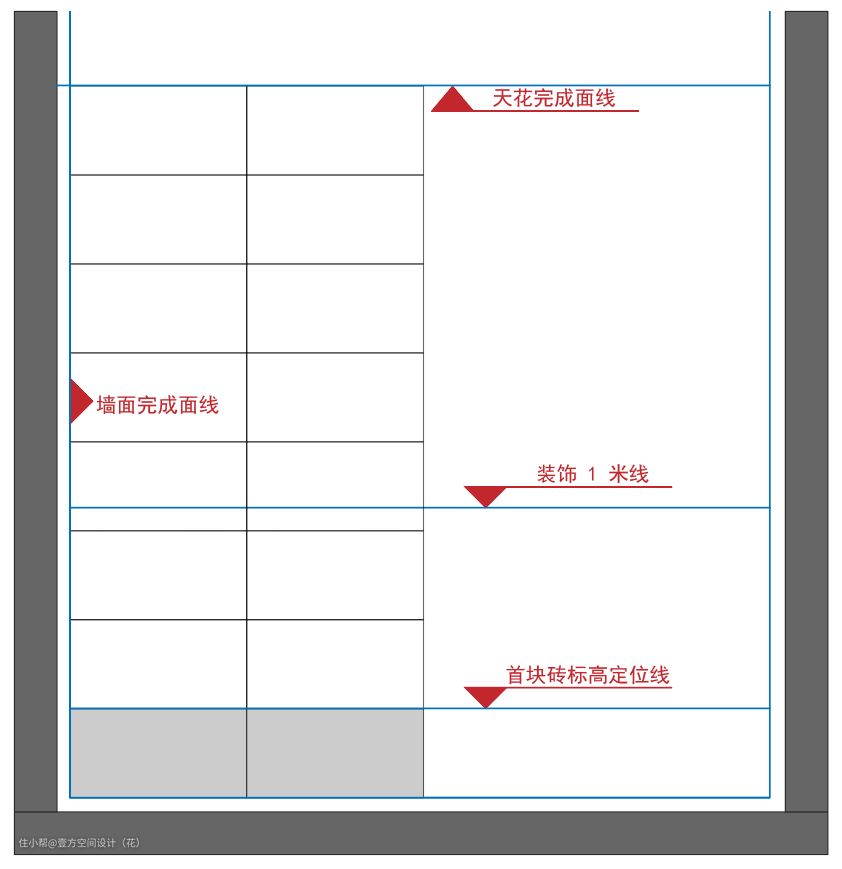 (4)铺贴时,严禁在卫生间墙角处打钉拉控制线,破坏防水层,损伤墙内预埋冷热水管;