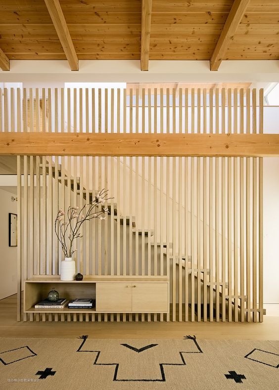③把木栅栏装到顶装到底也很不错,她家围出了一个类似天井的样式,中间摆放窄柜或者绿植都可以,一个颜值高的楼梯就形成了。