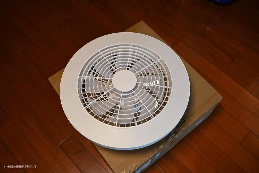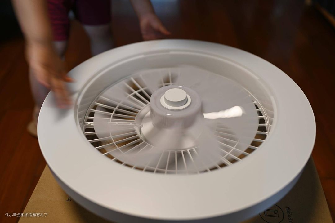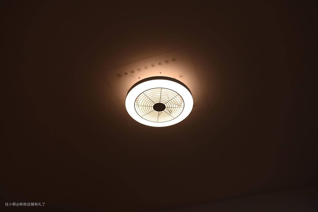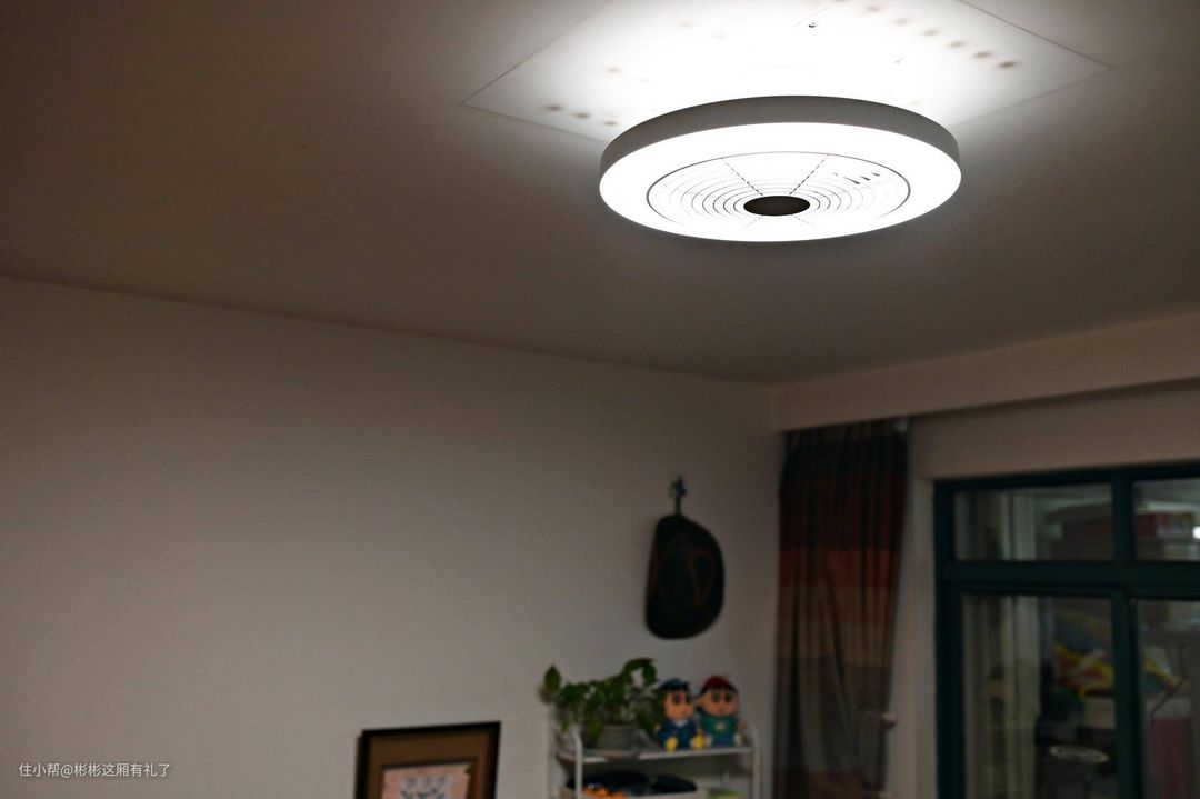 不过说实话,风扇体验起来有些复杂,可能因为风扇的尺寸并不大,而且扇叶在灯具的中间,像一个通道一样,所以气流是聚集往下吹的,有点像电吹风,坐的离风扇底下稍微远一点,面部就感觉不到风了,就得把风扇档位再调大一些,腿部才能感觉到吹来的风。在最大档位时,声音有点大啊。