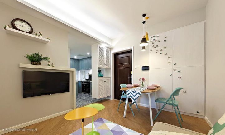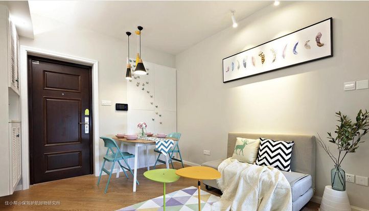 客厅的风格很是清新,墙面虽然掺杂了多种颜色,但是浅色打底反而让空间凸显了一种清爽之感。
