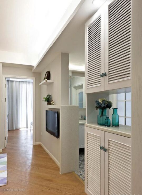 经过设计师的巧妙设计合理布局,没用浪费每1㎡,玄关处与餐厅一体,在右侧设计一排柜子,底部镂空放置日常鞋子,餐厅后边做一组衣柜增加收纳。