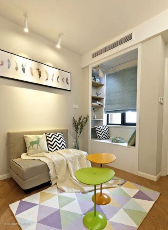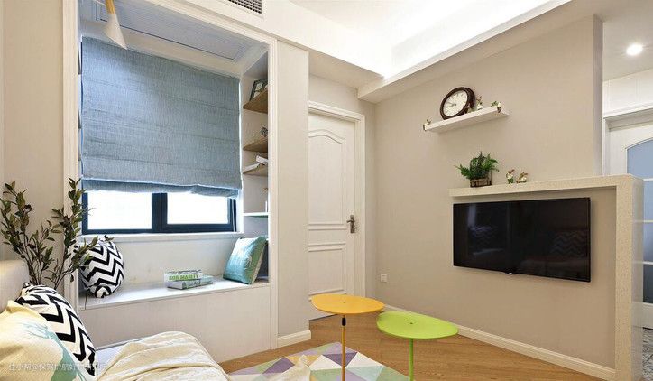 可以说每个空间都尽可能利用到,由于客厅本身面积有限,在于浴室公用的墙壁上安装电视机,所幸旁边是一扇飘窗,做成榻榻米式很舒服。