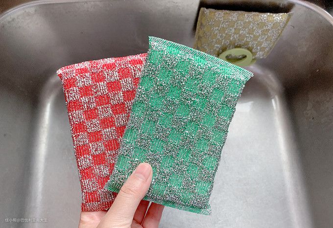 百洁擦几乎家家都有吧,清洁轻度污渍,用来洗碗、刷不粘锅等最合适不过。内里是弹性很好的海绵,柔软吸水,外层是铝钛合金丝,不含磨料,不易留划痕。像碗底那些黏糊糊的食物污渍、锅底煮面时粘住的面条,用百洁擦来回几下就蹭干净了。